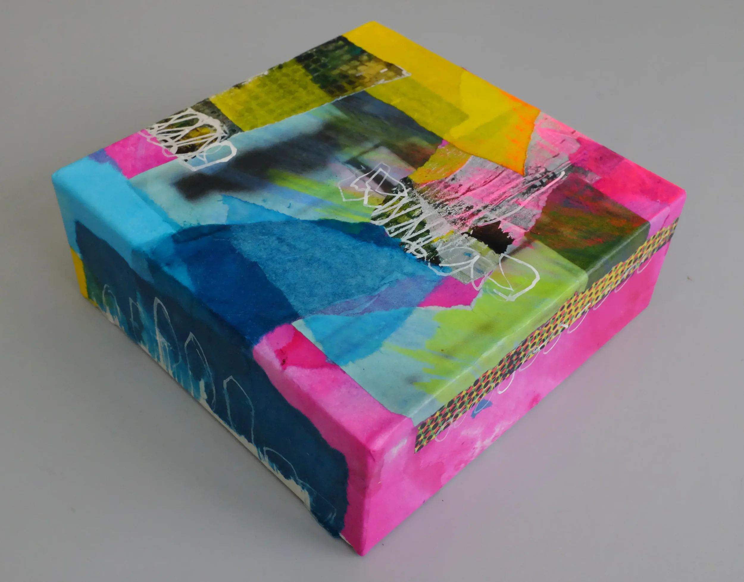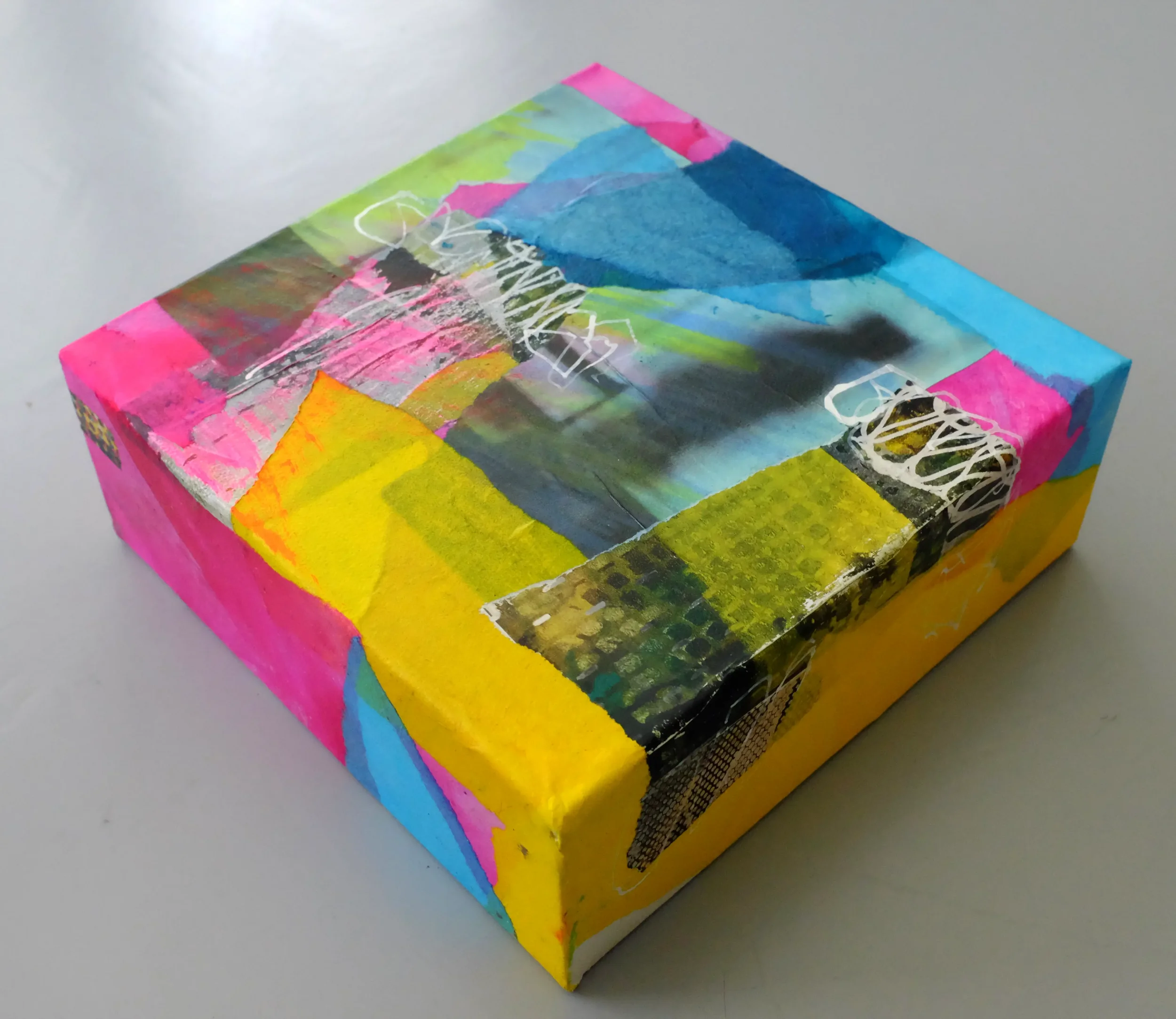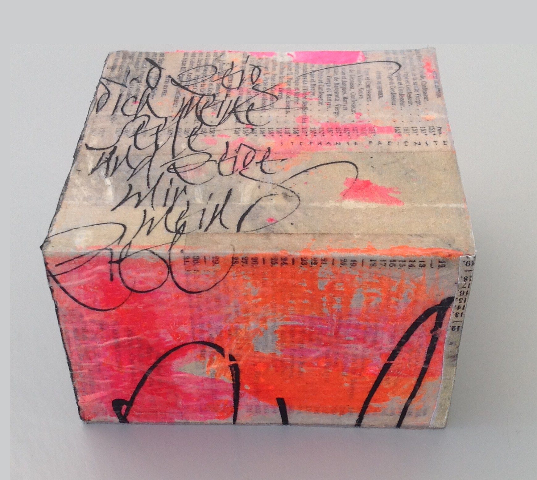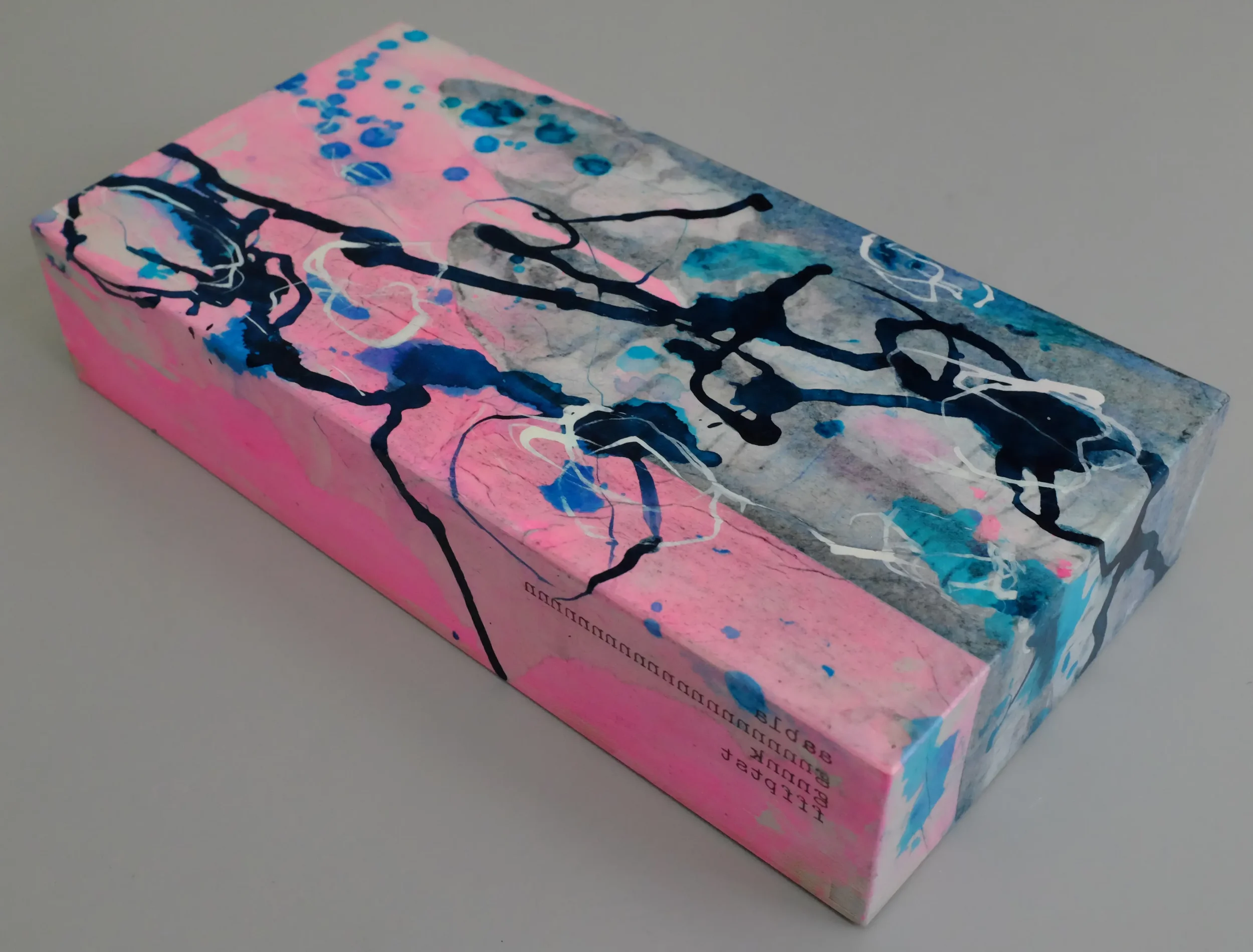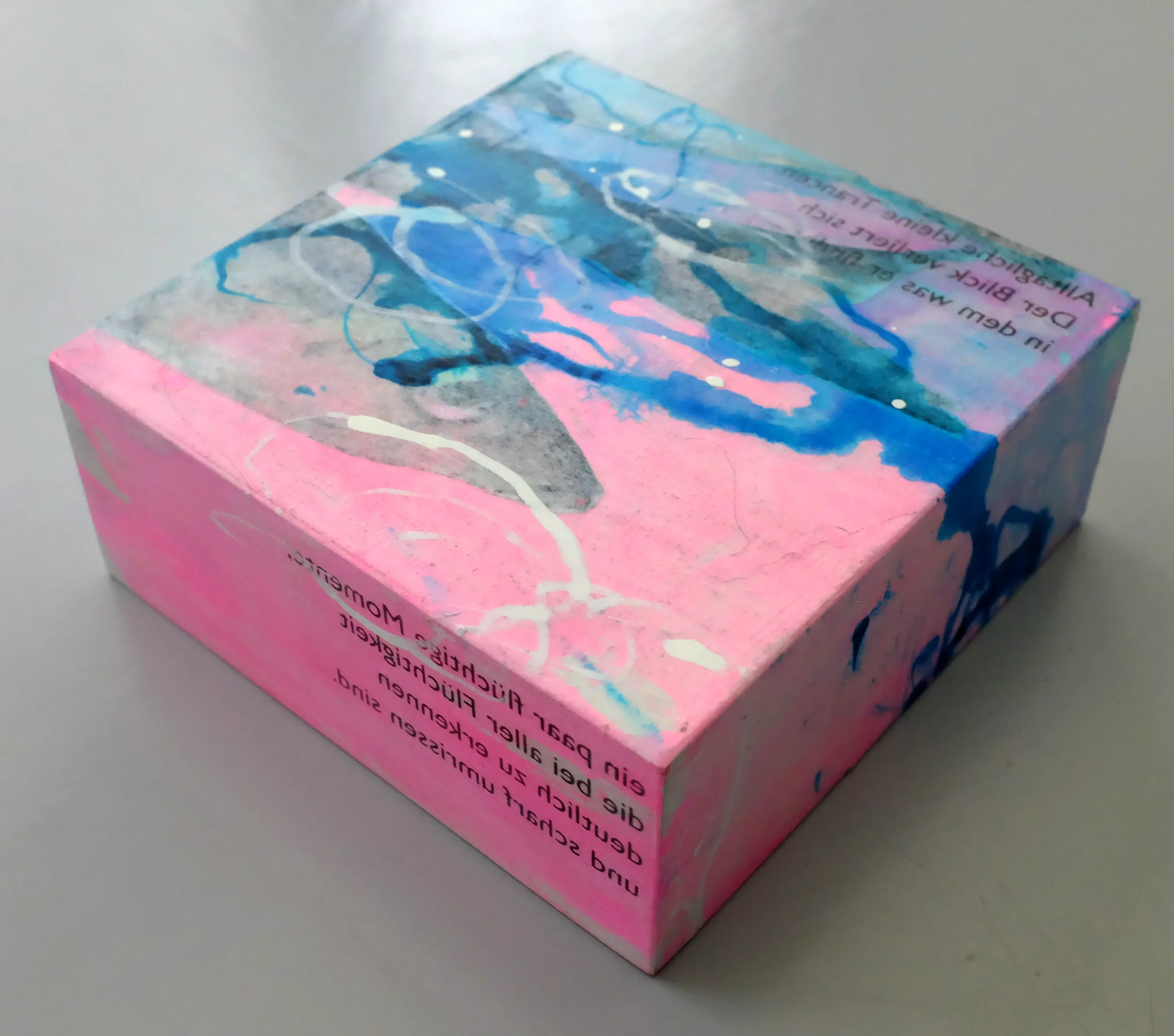 Geschichten, Fragmente und Emotionen verarbeitet Angie Huber in ihren dreidimensionalen Kleinformaten. In ihrer kompakten Form entfalten die BOXES genannten Holzkörper eine expressive Kraft. Farbe trifft Fläche, Text überlagert Bild, Schichten wachsen übereinander, stossen an, verbergen, erzählen. Diese kleinen Werke sind verdichtete Bildräume. Sie laden ein, näher zu treten. Denn was auf den ersten Blick spielerisch erscheint, entfaltet bei genauerem Hinsehen Tiefe, Widerspruch, Poesie.